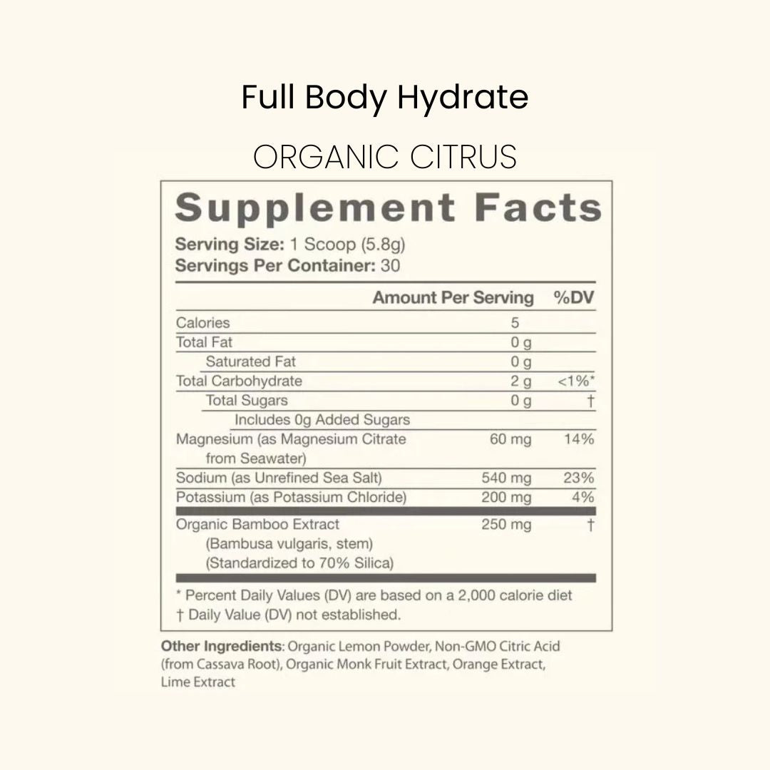 It's estimated that 90% of people are chronically dehydrated, leaving them brain fogged and sluggish. Proper hydration powers your brain, muscles, and mood. Full Body HYDRATE is packed with trace minerals and electrolytes to help your body absorb what it needs. - Nutrition That Grounds You
