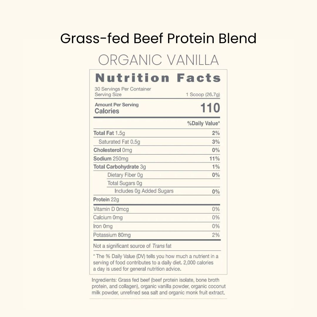 Grass fed beef (beef protein, bone broth protein, and collagen), organic vanilla powder, organic coconut milk powder, unrefined sea salt and organic monk fruit extract.