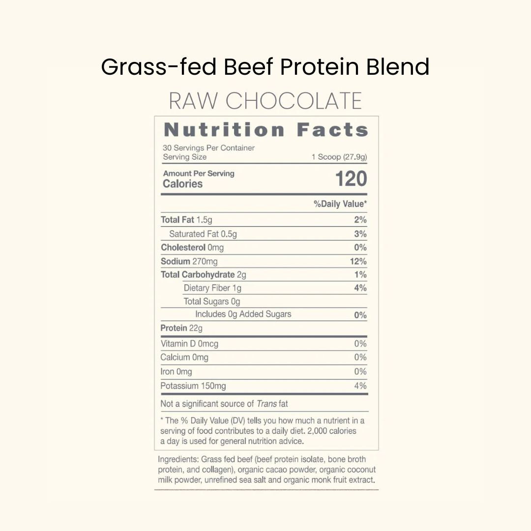 Grass fed beef (beef protein, bone broth protein, and collagen), organic cacao powder, organic coconut milk powder, unrefined sea salt and organic monk fruit extract.