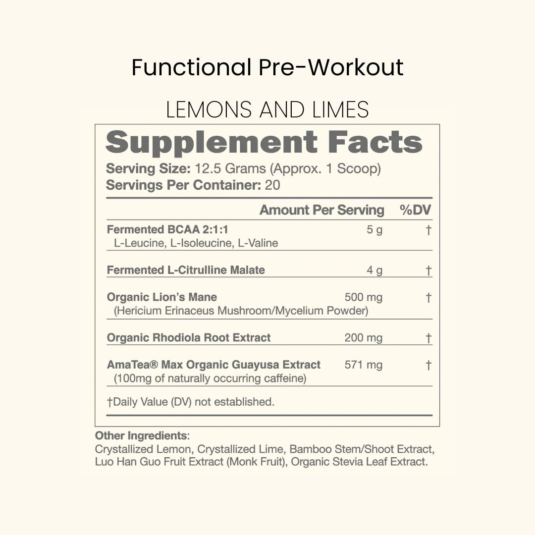 Fermented BCAA’s, Fermented L-Citrulline, Organic Guayusa Extract, Organic Lion’s Mane Mushroom, Rhodiola Root Extract, Crystallized Lemon, Crystallized Lime, Monk Fruit, Organic Stevia Leaf, Bamboo Extract
