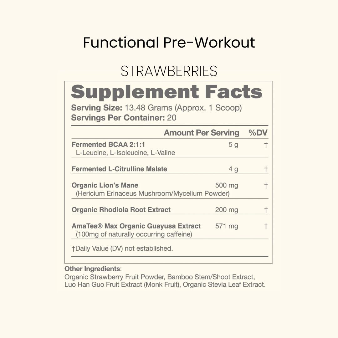 Fermented BCAA’s, Fermented L-Citrulline, Organic Guayusa Extract, Organic Lion’s Mane Mushroom, Rhodiola Root Extract, Organic Strawberry Powder, Monk Fruit, Organic Stevia Leaf, Bamboo Extract